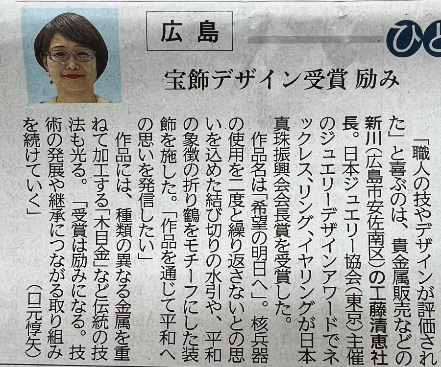 【メディア掲載】中国新聞お知らせ 12月2日(土) 中国新聞に掲載されました JJAジュエリーデザインアワード2023 JJA Jewelry Design Awards 2023 画像:JJAジュエリーデザインアワード2023作品集 作品名 / 希望の明日へ ネックレス/リング/イヤリングセット/K18・PT900・赤銅/アコヤ真珠/ダイヤモンド 平和のシンボル『折鶴』と、二度と繰り返さない意の『水引』、希望の明日を『和』の世界で表現いたしました ~広島から世界へ~陰陽説に陰と陽のバランスが大切であるという古来からの概念をこの作品において折鶴として結びきりの水引は2度と核兵器の使用を繰り返さないメッセージを込め、表現致しました 展示期間 本通り 2023年11月26日(日)~1月7日(火)