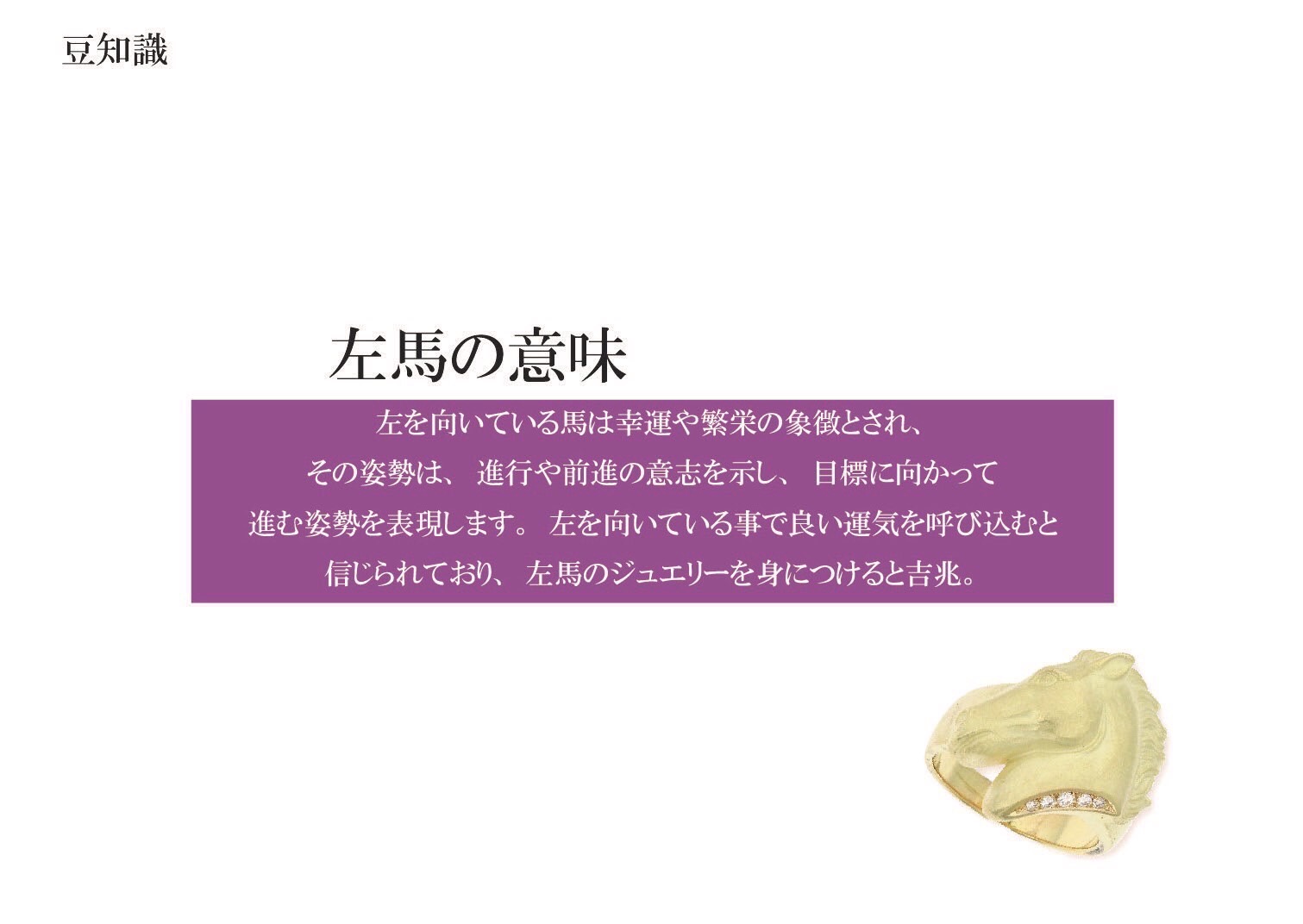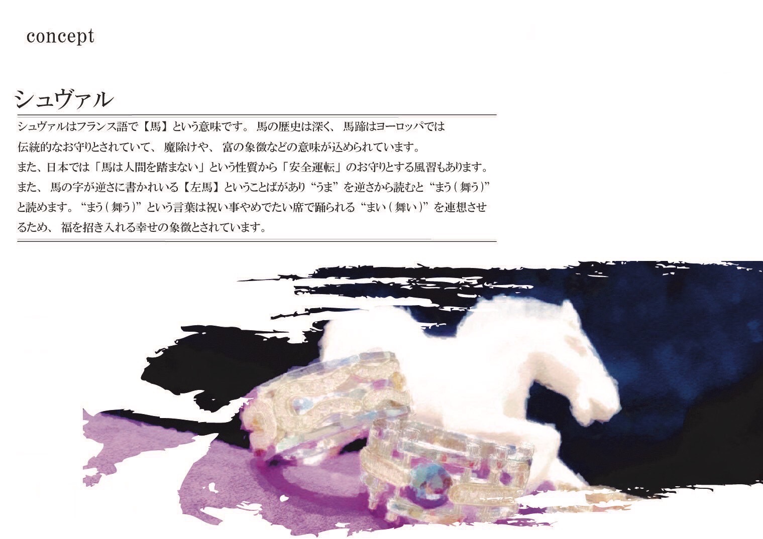 シュヴァル 目次 01 Concept コンセプト 02 Designer デザイナー 03 Craftsmanship 携わる職人たち 04 Cravater(結馬)シリーズ 05 Amour(無限の愛)シリーズ 06 Bonheur(幸蹄)シリーズ 07 豆知識 左馬の意味 08 Collection コレクション