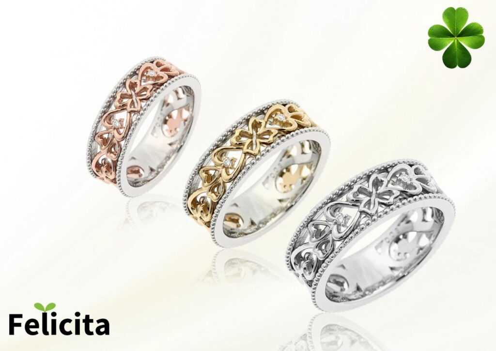幸せのクローバーをモチーフにして、重厚感と軽快感を両立させたリングです。リングの厚みはしっかりとって上下にミル打ちパターンを、中央は異なる貴金属の2層構造にしています。リングが回っても模様が途切れることがありません。普段使いに最適なしっかりしたリングで、さりげなく付けたダイアモンドもほとんど引っ掛かりがないように仕上げています。幸せが途切れることがないように、ペアリングとしても自分へのアニバーサリーリングとしても最適です。