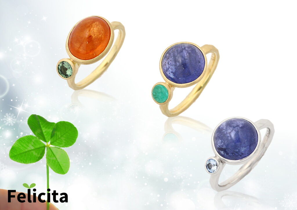 カボッションのカラーストーンを中心として、シンプルかつ大人かわいいデザインに仕上げました。サイドストーンは片側のみ。上記写真中央のリングは中央にタンザナイトカボッションカット、ブラジル産パライバトルマリンのカボッションカットをというこだわりのセッティングをしています。