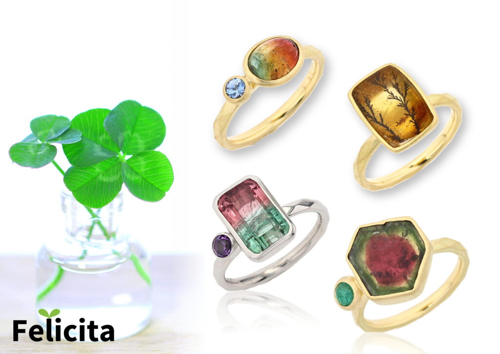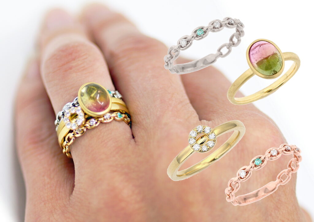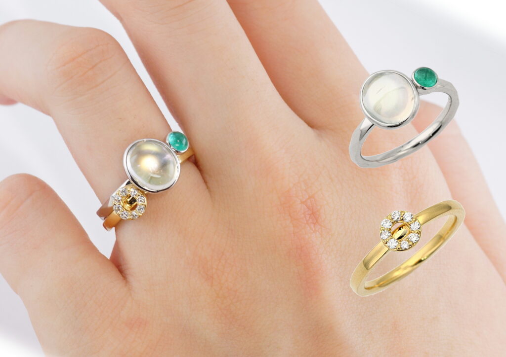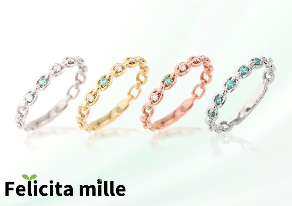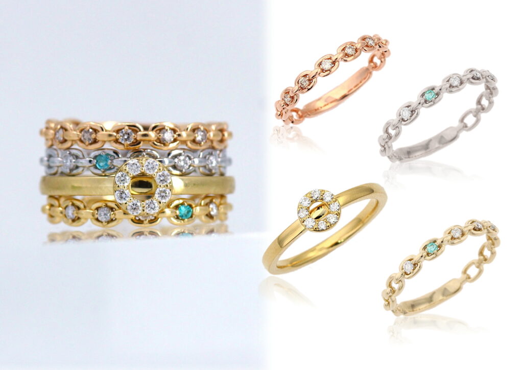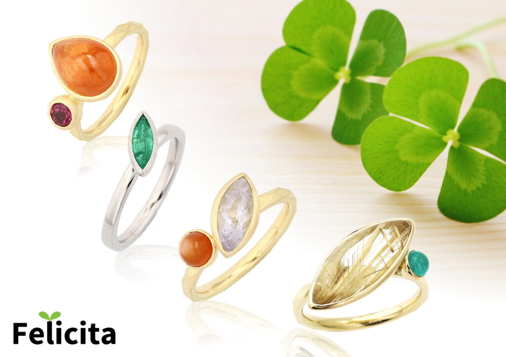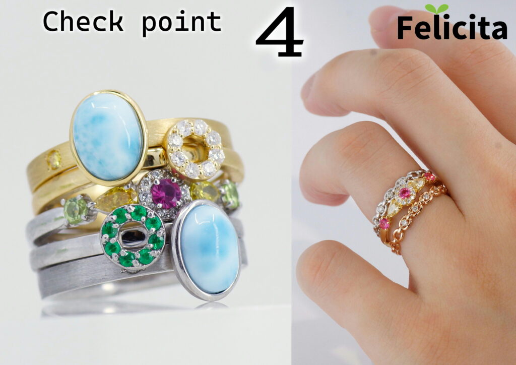 フェリチッタの肝の部分、重ね着けしても相互のリングが干渉しないように設計されています。宝石を取りつけてある部分を腕の上部に配置することで、重ねたリングがきれいに宝石の下に重なります。いろいろな組み合わせの重ね着けを楽しめるのがフェリチッタの最大の特徴です。