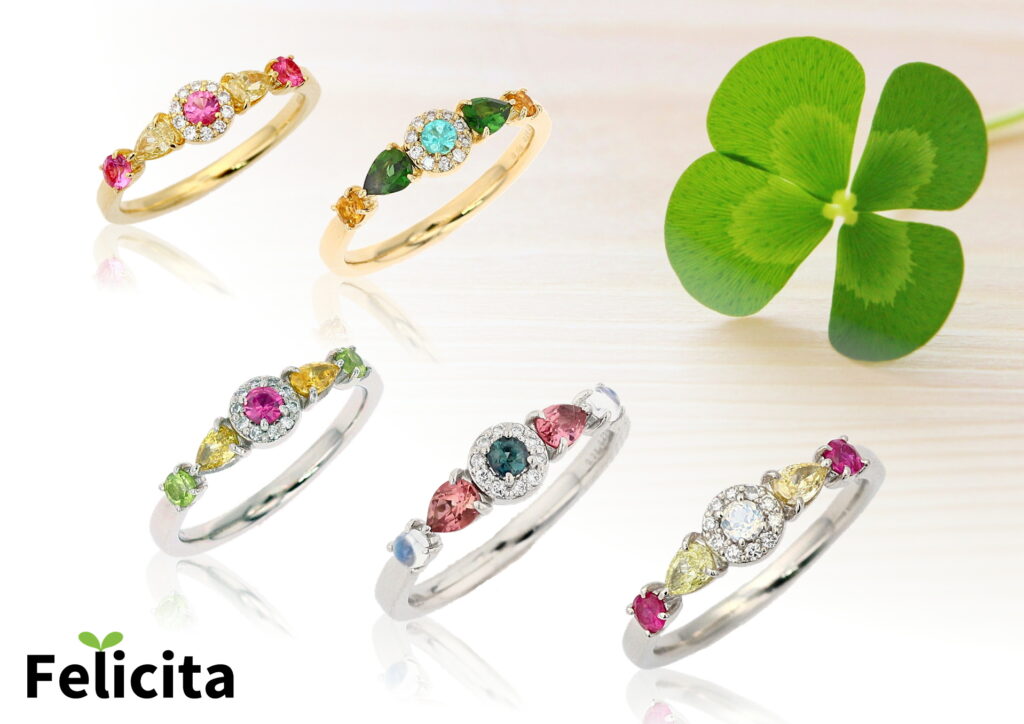 PTパライバトルマリン・ダイアモンドリング(左上)/K18バイカラートルマリンリング(右上)/K18ダイアモンドリング(左下)/K18PGパライバトルマリン・ダイアモンドリング(右下)