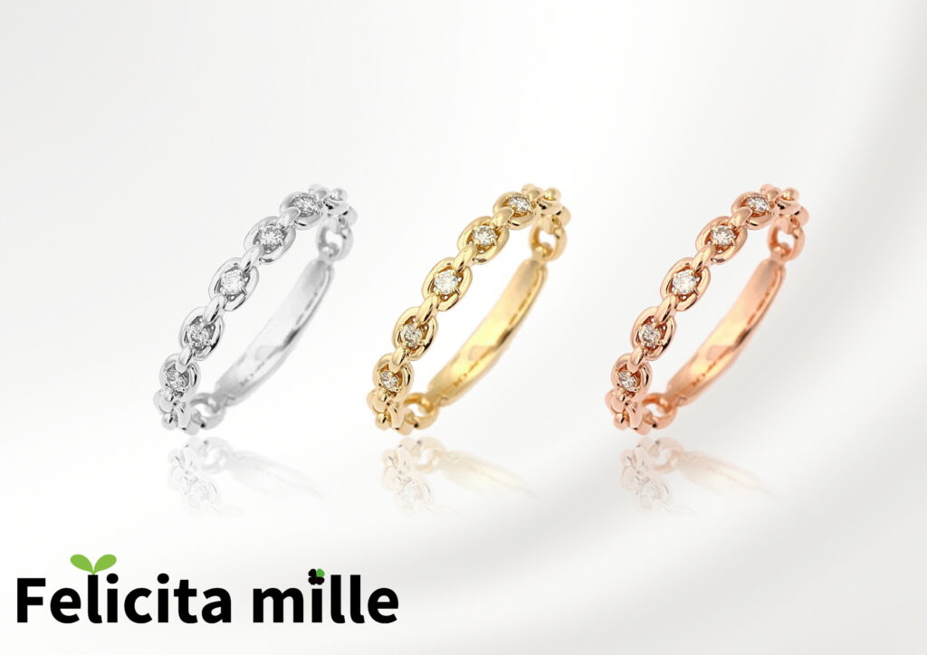 鎖をモチーフにして、フェリッチッタ制作の想いのひとつである「絆」を象徴しました。重ね着けの定番ラインです。できる限りダイアモンドを留める爪を小さくして、引っ掛かりなく日常使いできるように仕上げています。
