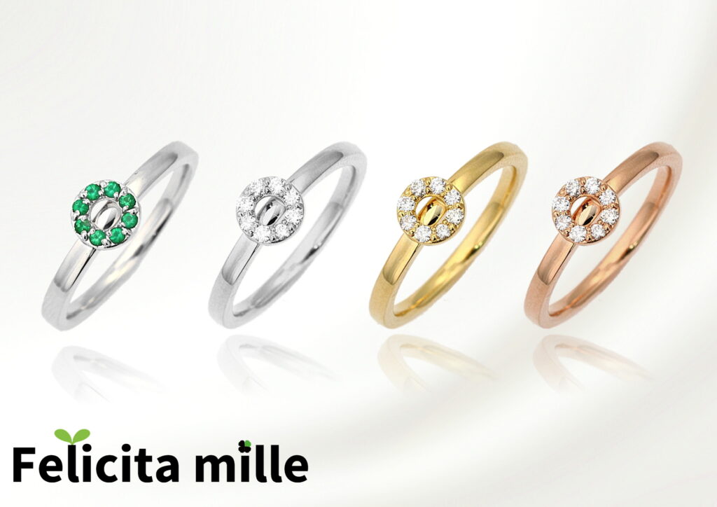 丸い円をモチーフにして、フェリッチッタ制作の想いのひとつである「ご縁」を象徴しました。曲線で成り立つ円を、角の立たない縁として表現しています。これも重ね着けの定番ラインで、アクセントの円を左右にずらして重ねて着けることで主役にも脇役にもなれます。