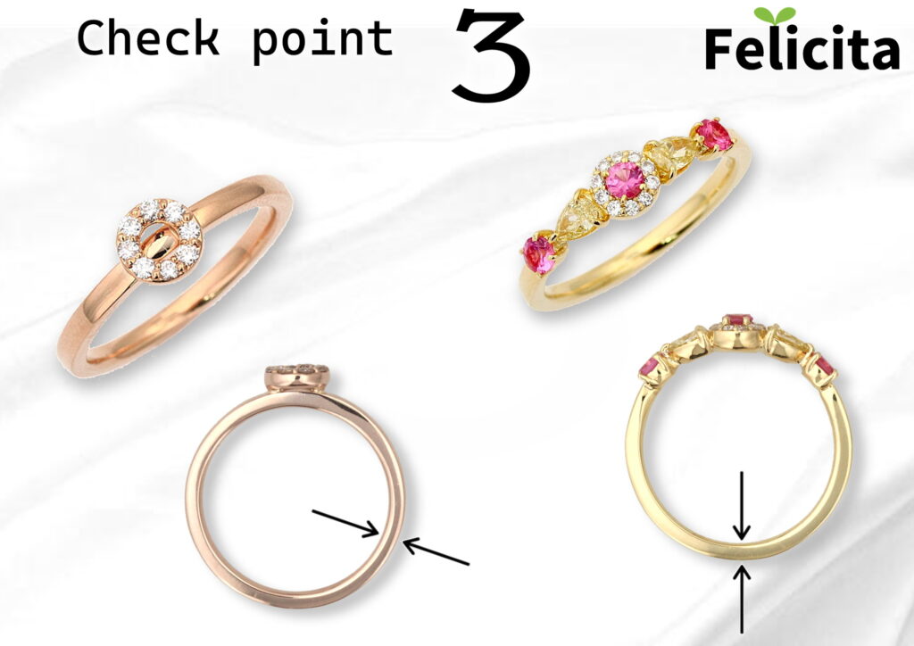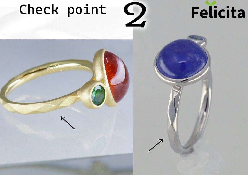 日常に使っていただけるように、リングの腕の厚みをしっかりとっています。貴金属を充分使用して、幅の割に厚みをとることで変形しにくくしています。軽量化すれば価格は下がりますが、日常使いの安心感も下がります。指への着け心地も違ってきます。見逃されやすい部分も決して妥協しません。
