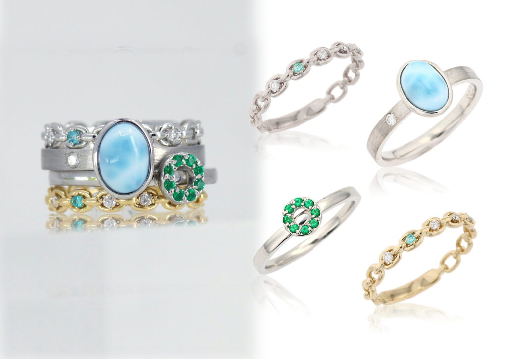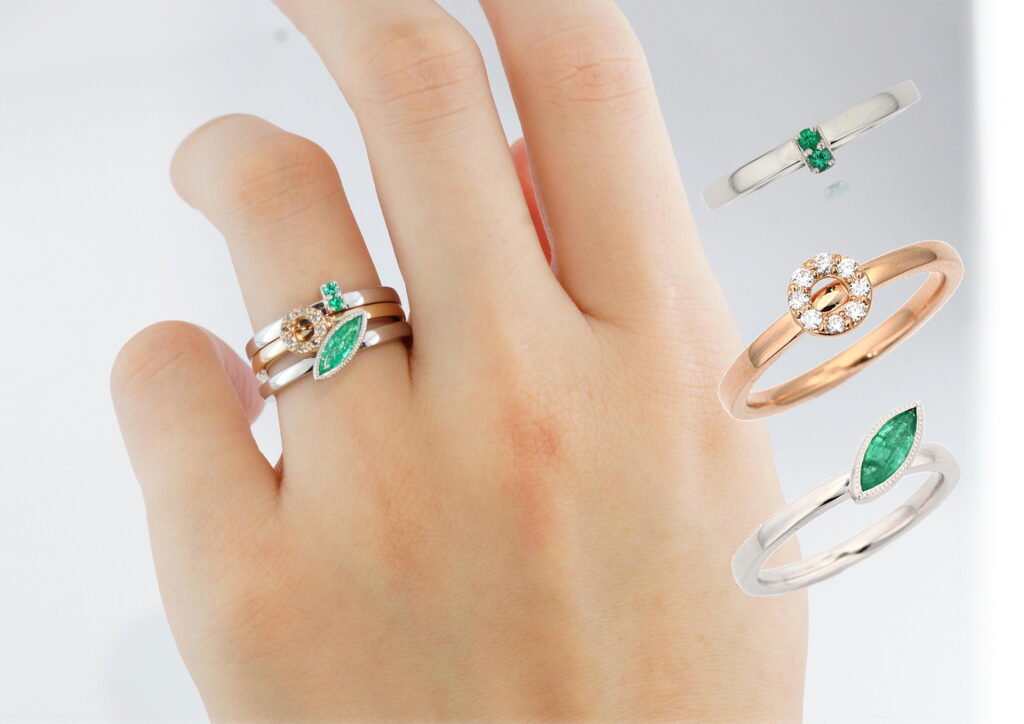 ハイクオリティのカラーストーンを使用したラインアップ。日常使いのカラーストーンジュエリーとして制作しているため、敢えて大振りの宝石は使用していません。上記写真のエメラルドは外部からの衝撃を防ぐために敢えてプラチナでエッジを取り囲んでいます。「小ぶりでも存在感のあるもの」。多様な価値観の中、人もジュエリーもそのようで在ってよいと思います。