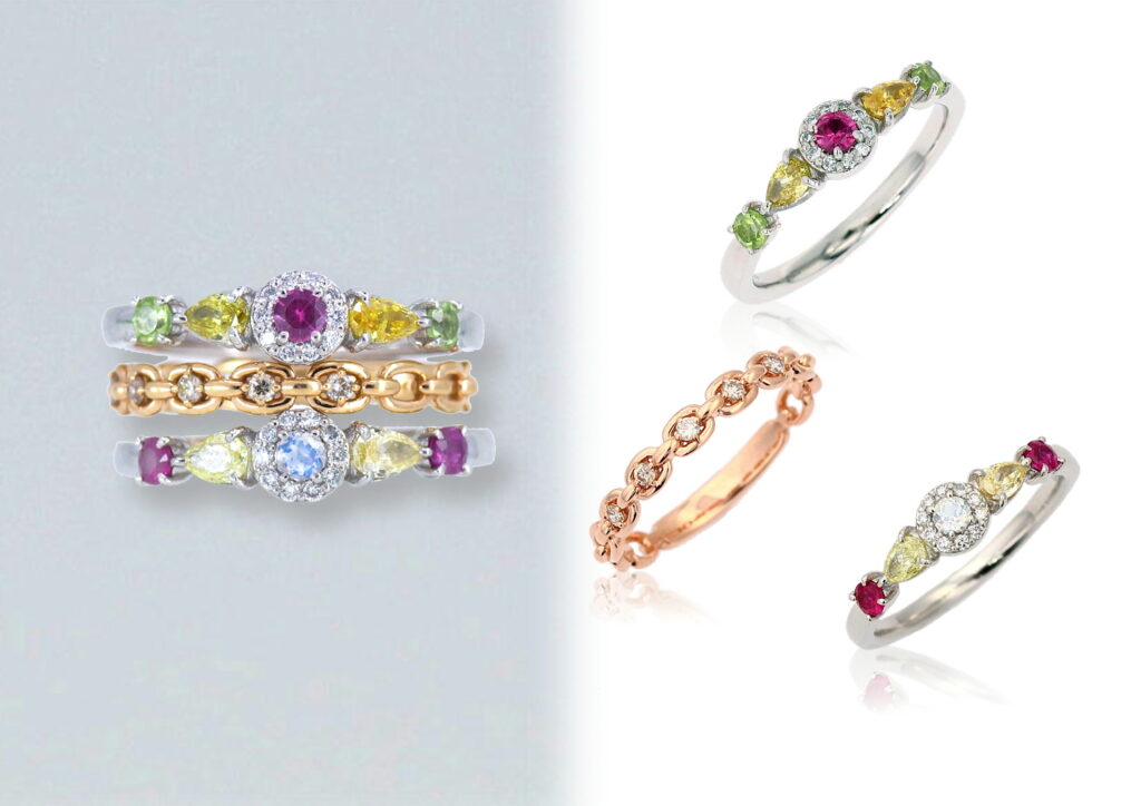 カラーだけでなくマーキースやペアシェイプなどの形も楽しんでいただくためのラインアップです。ひとつまたはふたつの宝石には必ずカラーストーンを使用しています。色と形の組み合わせの妙を楽しんでください。他のリングとの重ね着けで、印象は驚くほど変わります。