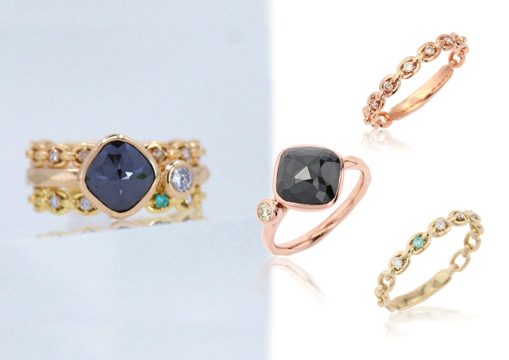 K18PGダイアモンドリング(上)/K18PGブラックダイアモンドリング(中)/K18パライバトルマリン・ダイアモンドリング(下)