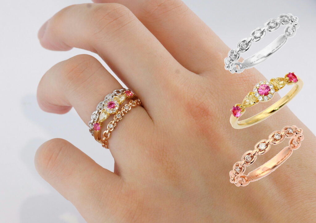 PTダイアモンドリング(上)/K18ピンクスピネル・イエローダイアモンドリング(中)/K18PGダイアモンドリング(下)