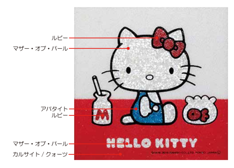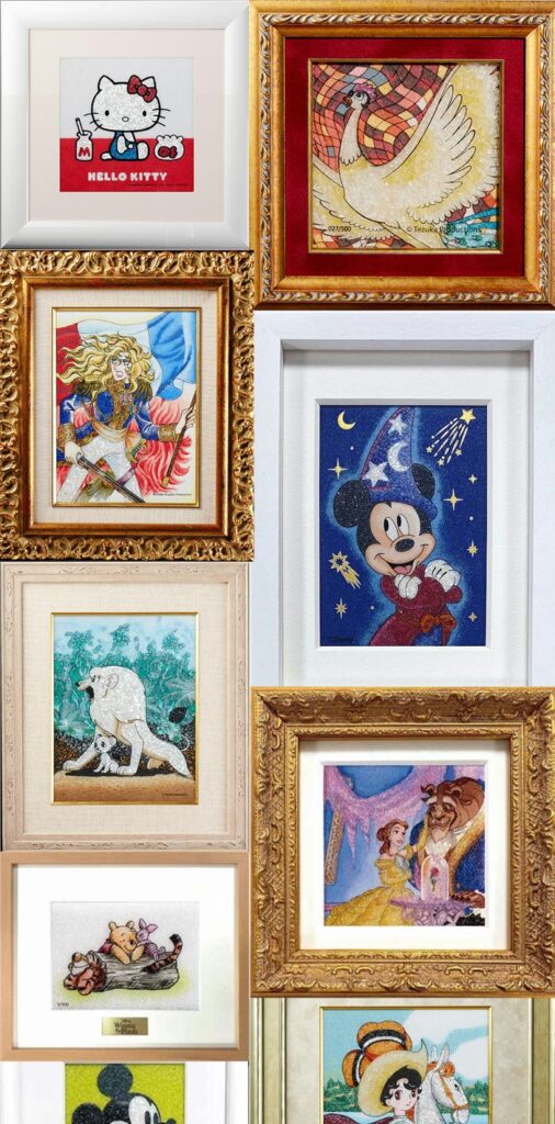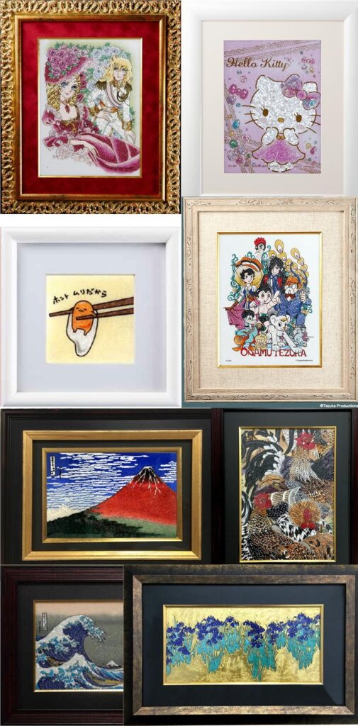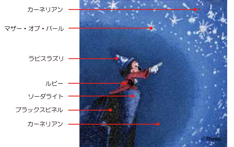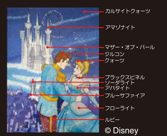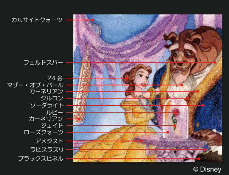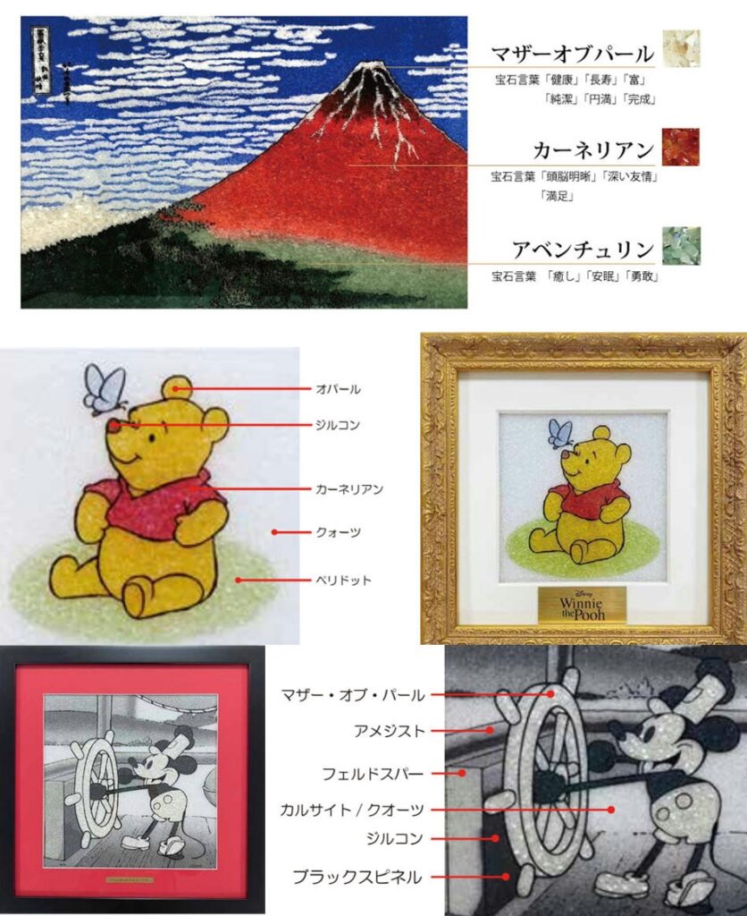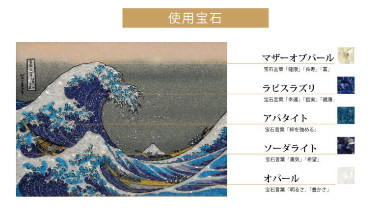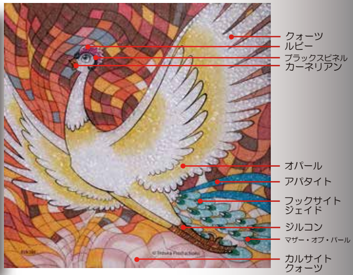 ジュエリー絵画は、枠線を除きすべての色をジュエリーを使用して描かれています。ルビーやラピスラズリなどのカラーストーンを様々な大きさの粒状またはパウダー状にして、日本の職人が原画に合わせて忠実に色合わせをしています。