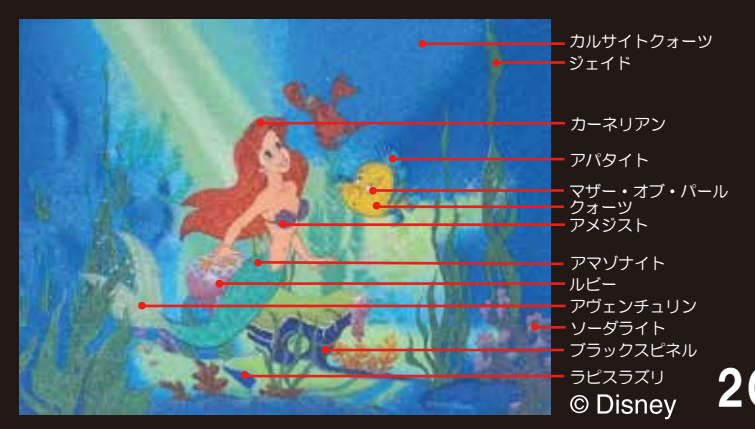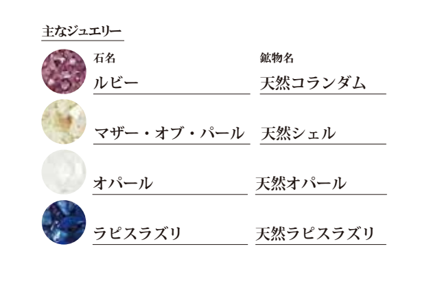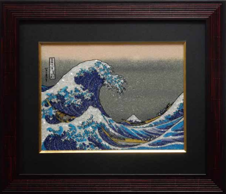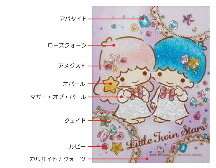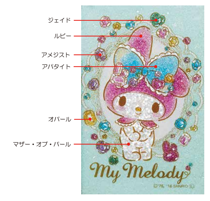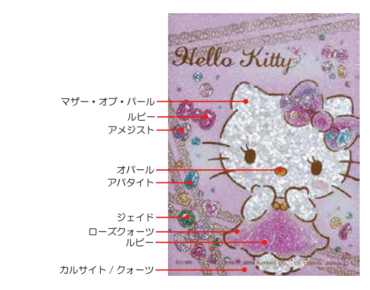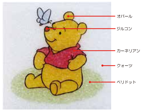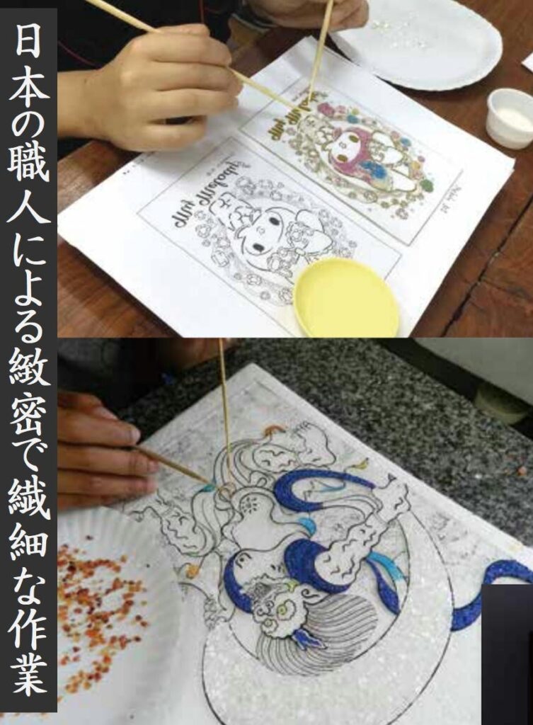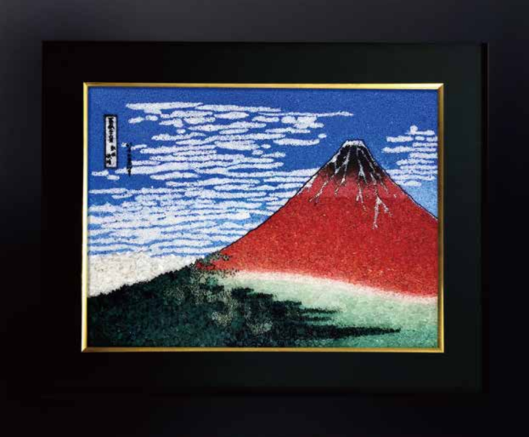 ジュエリー絵画は、枠線を除きすべての色をジュエリーを使用して描かれています。ルビーやラピスラズリなどのカラーストーンを様々な大きさの粒状またはパウダー状にして、日本の職人が原画に合わせて忠実に色合わせをしています。