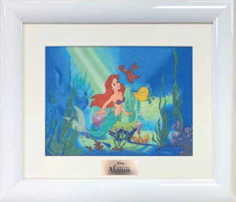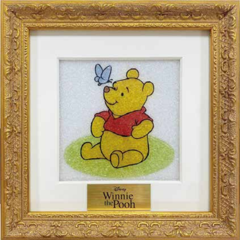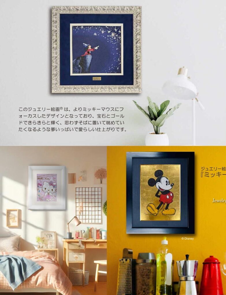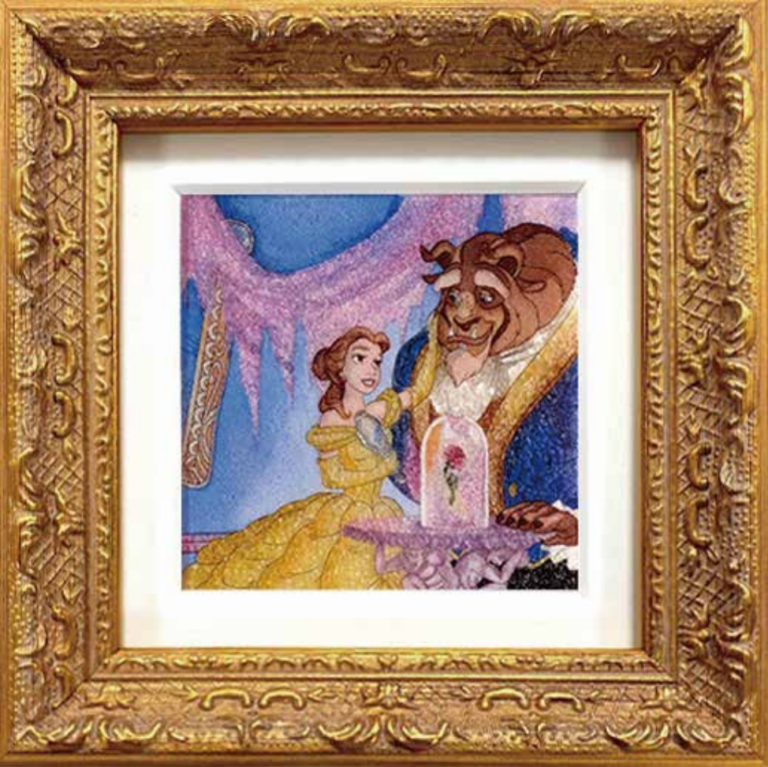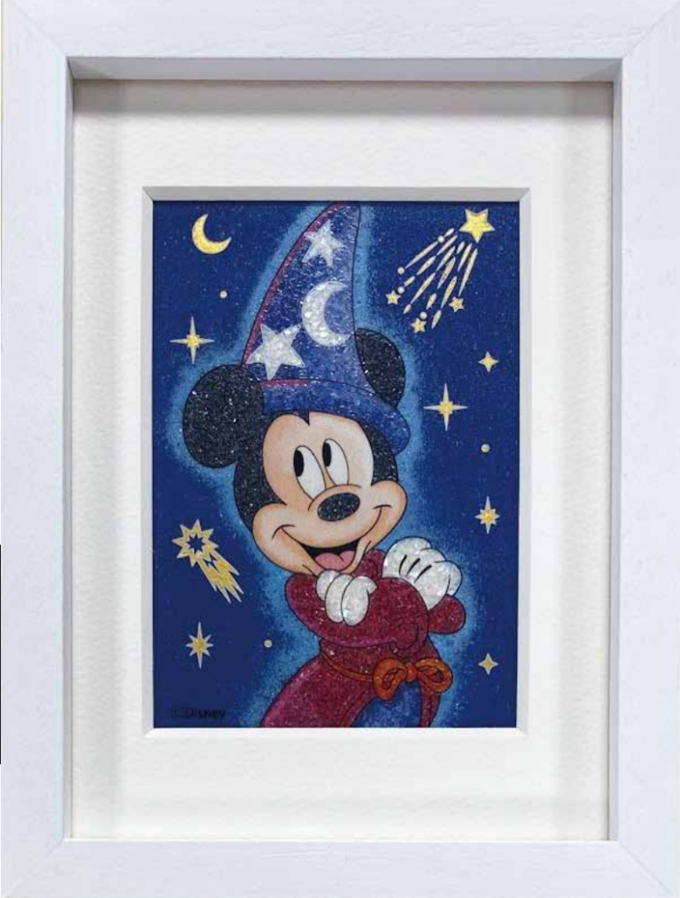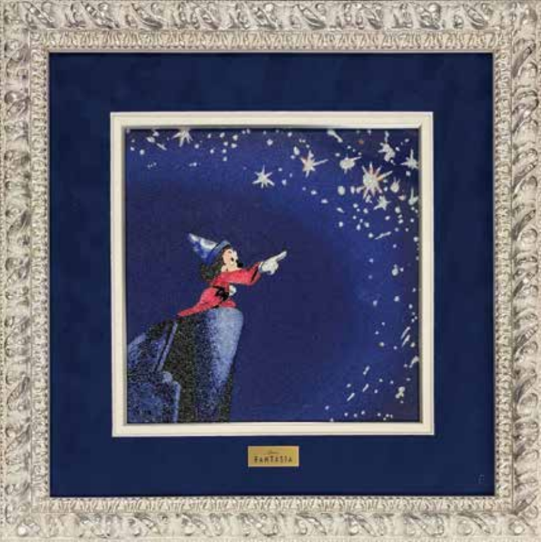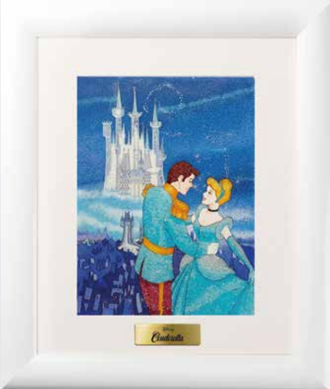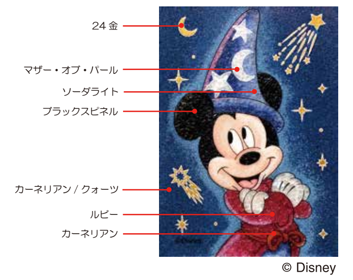 ミッキーにフォーカスしたこのジュエリー絵画®は、ルビーやマザーオブパールなど、魅力的な宝石たちで、色褪せることなく世界中で愛され続ける夢と魔法の世界を描き上げています。
