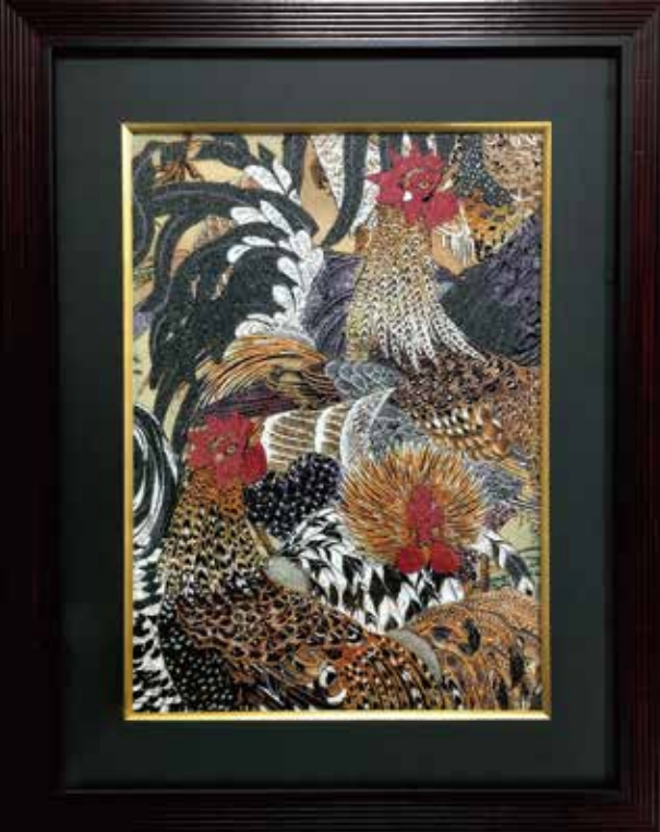 トサカの数から13羽の鶏が描かれていると分かりますが、羽が重なりあってまるで一塊の曼陀羅のよう、トサカの赤が鮮やかで印象的です。