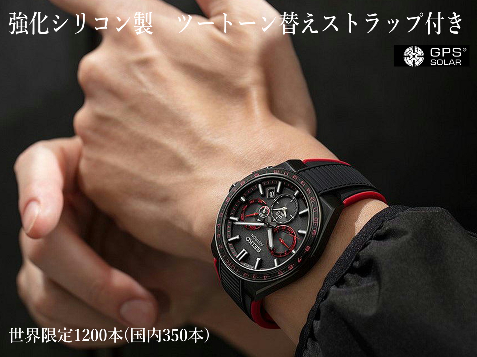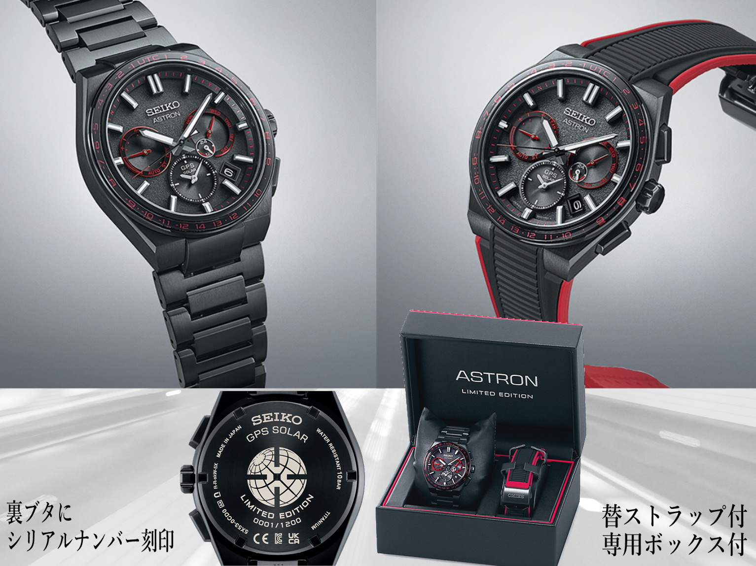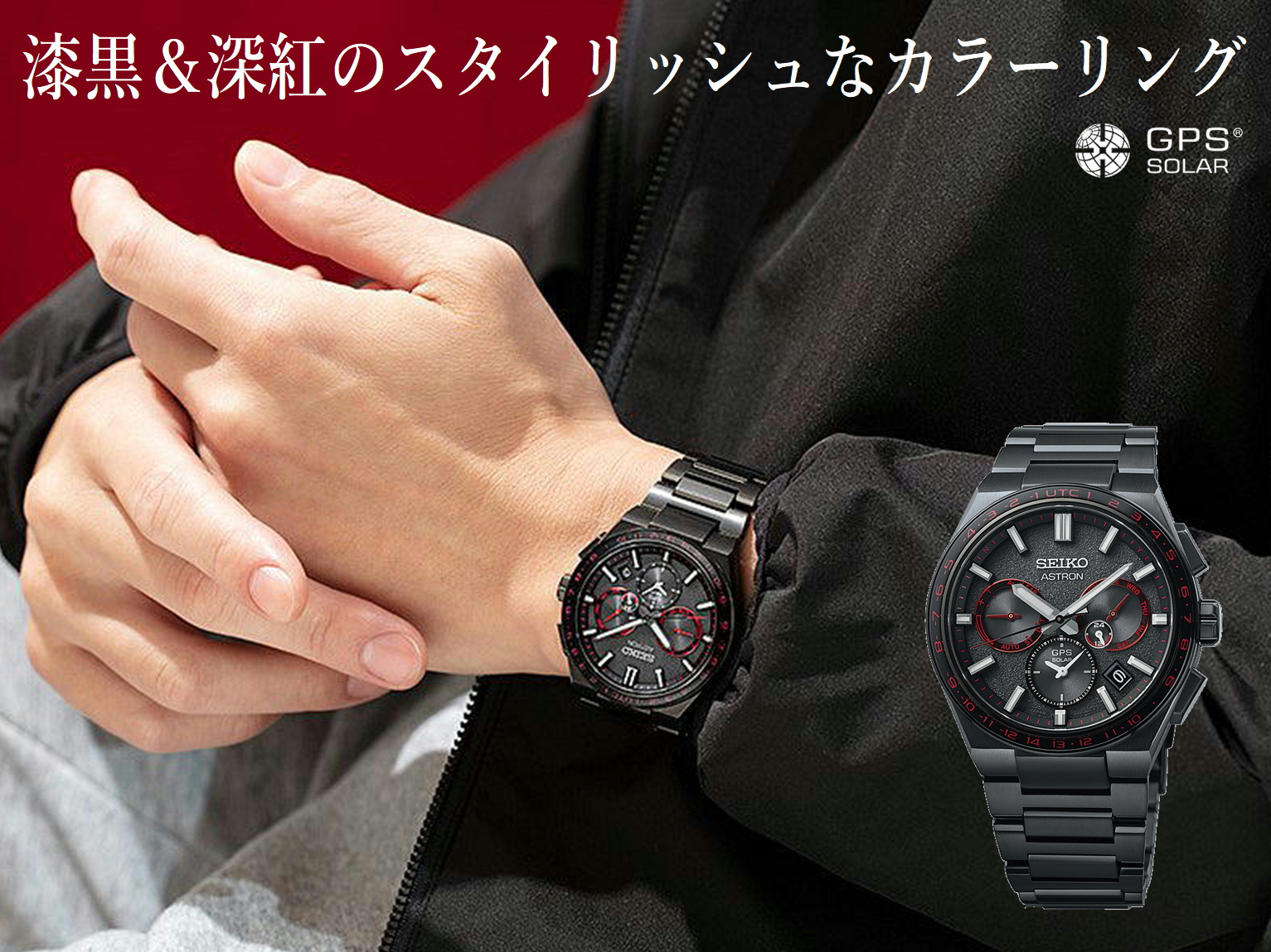 Seiko Astron Nexter GPS Solar 2023 Limited Edition GPS衛星電波ソーラー時計アストロンより、ブラック&ディープレッドの世界限定モデルが登場 *弊店を含むセイコーグローバルコアショップのみの取り扱いとなります。 2023年9月アストロンに新作限定モデルが登場。漆黒の本体に深紅の差し色のツートーンでよりスタイリッシュになりました。着け心地抜群の強化シリコンストラップが付属しており、金属バンドと交互に付け替えてお洒落が楽しめます。受信速度、精度、防水性、耐傷性などの日常使いに十分なスペックです。 本体とブレスレットは純チタン製で、軽くてアレルギーフリー。ダイアシールドのコーティングは通常のステンレスの3倍の硬さがあるので、小傷も付きにくく日常使いに最適です。この限定モデルは従来のものと比べてツートーンのカラーリングが秀逸。ブラック、レッドを主な色使いにしている人や、モノトーン主体でお洒落を楽しんでいる人には特におすすめです。 セイコーのシリコンストラップは経年劣化が少なくラバーと比べて肌当たりがとても良いです。これを装着するとさらに時計の軽さが際立ちます。文字盤にはアスファルト柄が取り入れられ、さりげないこだわりを演出しています。 この時計を着けてカープの応援と洒落てみても良いかも。広島なだけにカープカラーを連想してしまいます。セイコーは大谷選手が日本に在籍しているころからスポンサードしています。セイコーにも野球好きがたくさんいるのでしょうね。 スペック 型番:SBXC137駆動方式:ソーラーGPS衛星電波修正精度:非受信時平均月差±15秒駆動期間:フル充電時約6ヶ月間 パワーセーブ時約2年石数:12石機能:過充電防止機能・パワーセーブ機能・パーペチュアルカレンダー機能(2100年2月28日まで)・ワールドタイム機能(39タイムゾーン)・デュアルタイム表示機能・曜日表示機能・パワーリザーブ表示機能・タイムトランスファー機能・衛星電波受信によるタイムゾーン修正機能・スーパースマートセンサー機能・捕捉衛星数表示機能・受信結果表示機能・DST(サマータイム)機能・受信オフ機能(機内モード)・針位置自動修正機能材質:純チタンケース(スーパー ブラックダイヤシールド)ベゼル:純チタン(スーパー ブラックダイヤシールド)(表示板:サファイアガラス)ケースコーティング:スーパー ブラックダイヤシールド本体サイズ:厚さ:12.2mm横:42.7mm縦:48.0mmガラス材質:サファイアガラスコーティング:スーパークリア コーティングルミブライト:あり(針・インデックス)中留:ワンプッシュ三つ折れ方式腕周り長さ(最長):190.0mm防水:日常生活用強化防水(10気圧)耐磁:あり重さ:105.0gその他特徴:裏ぶた「LIMITED EDITION」表記・裏ぶたシリアルナンバー入り・シリコン替えバンドつき・スマートアジャスター機構つき中留・Comfotex・スクリューバック 価格 世界限定1500本(国内350本)セイコーグローバルコアショップ専用モデル定価 330,000円(税込)48回まで無金利 弊店独自の5年保証 外装クリーニング永年無料 シンカワジュエリー可部店で時計を選ぶ5つの理由 アストロンの特徴とコーディネート例