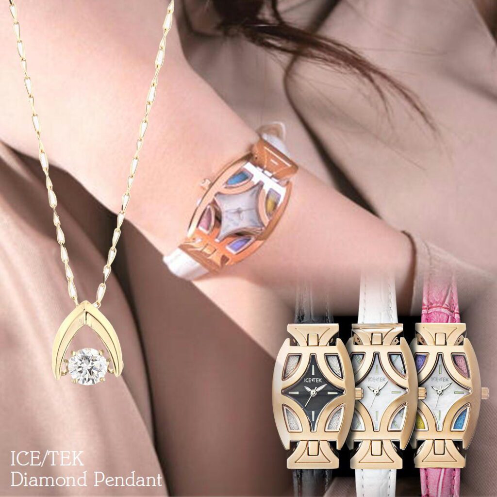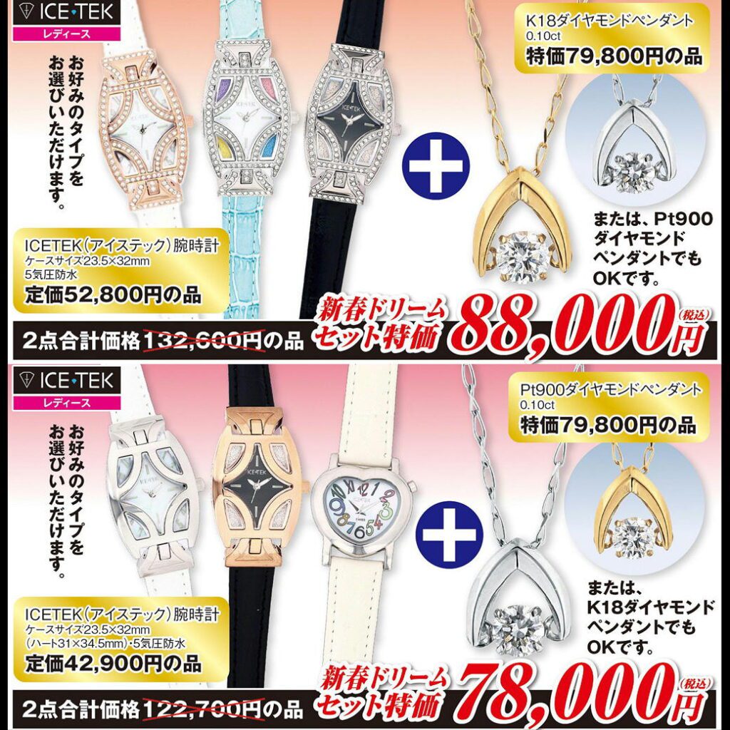 新春を祈念して、アイステック「ピクシー」時計と、K18またはプラチナ製ダンシングダイヤモンドペンダントをセットで、特別価格にてご提供します。