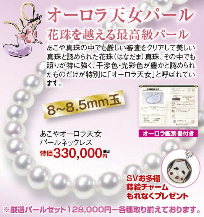 極上の照り。代々受け継がれるべき自慢の逸品としても充分なクオリティの鑑別書付オーロラ天女ネックレスです。