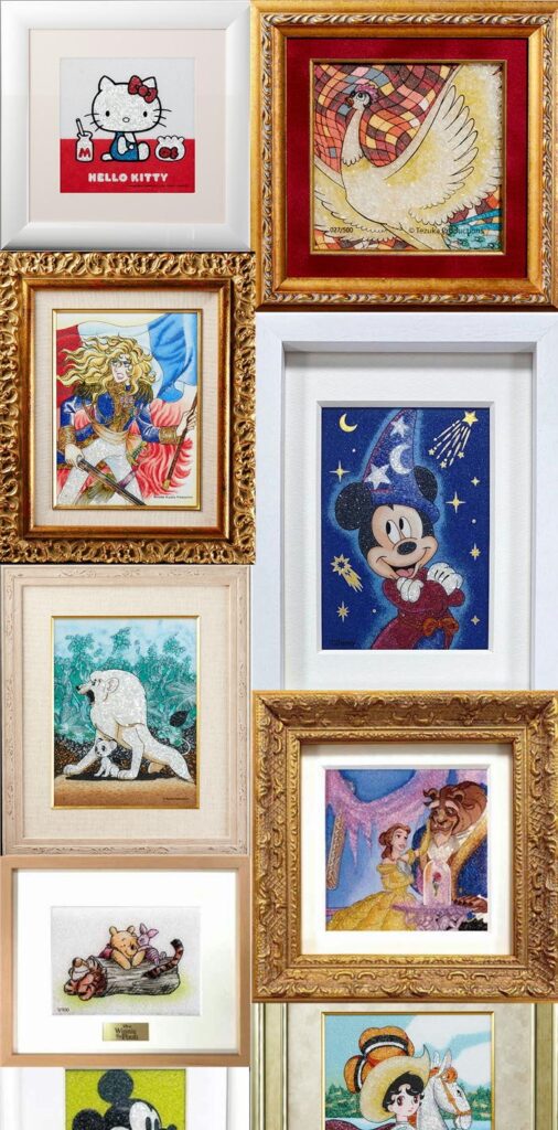 近代、ヨーロッパの芸術に大きな影響をあたえたジャポニズムを代表する葛飾北斎から、火の鳥、ジャングル大帝など世界的な名作を描き上げた手塚治虫、ミッキーマウスをはじめとするディズニーなど、後世に伝えるべき不朽の名作を、色褪せることのないジュエリーを使った絵画として表現しました。日本の職人がひとつひとつ丁寧に描き上げていきます。